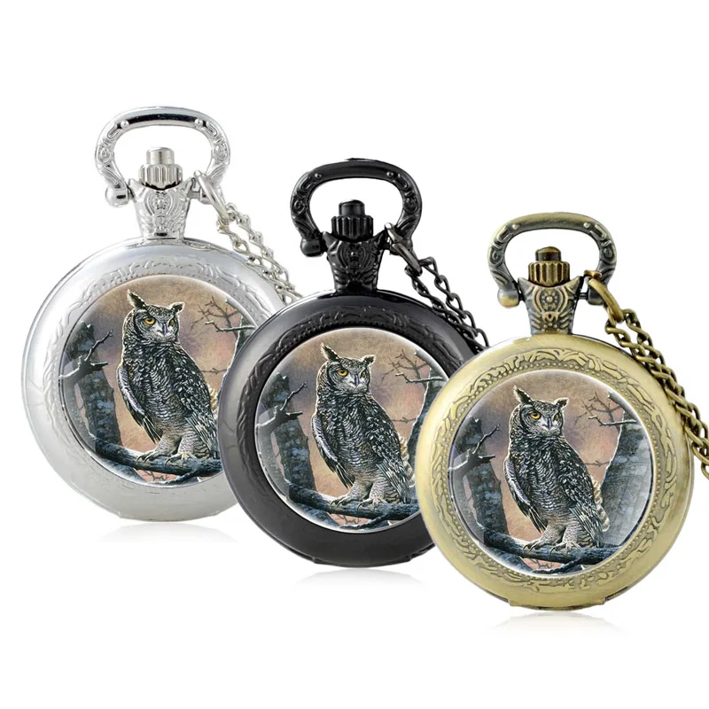 Name: Reloj de bolsillo de cuarzo con cabujón de cristal de búho para hombre y mujer, colgante, cadena negra, reloj de horas, novedad de 2020